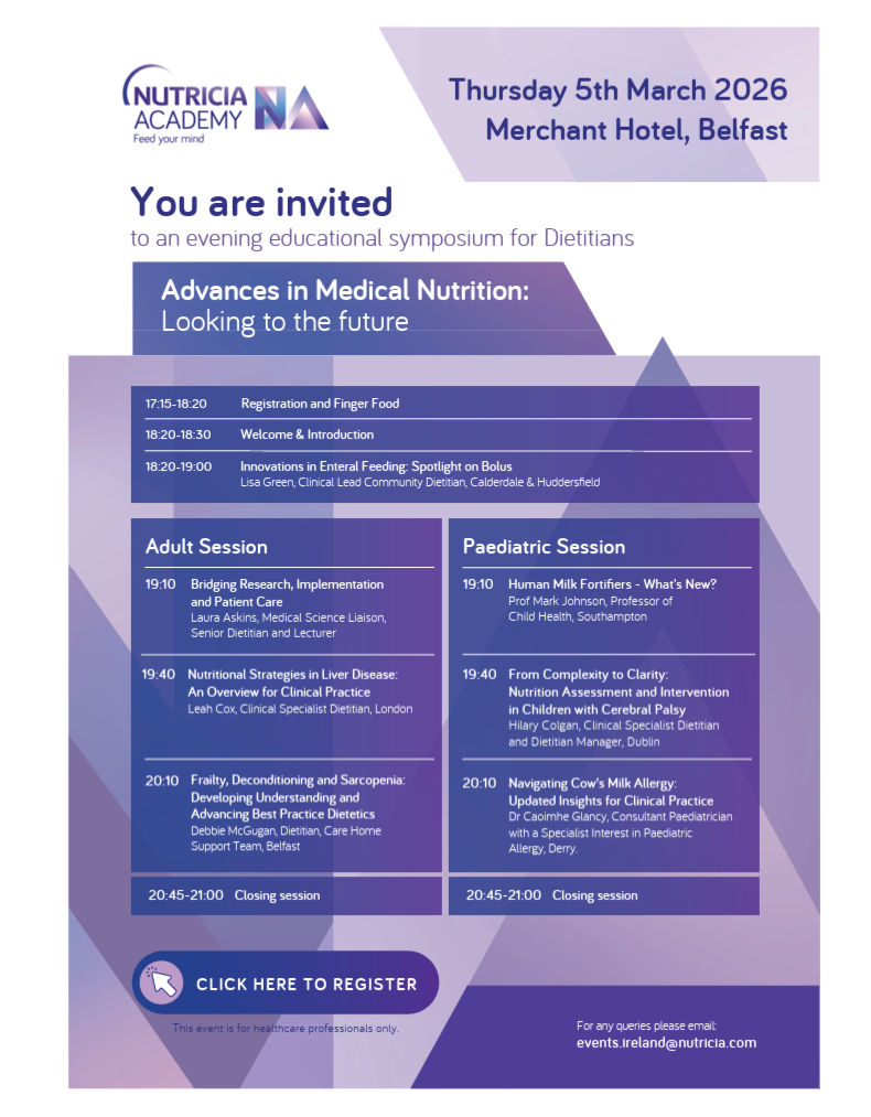 Nutricia are delighted to host this Evening Education Symposium for Dietitians. The programme will cover a variety of topics across adult and pediatrics providing valuable insight into the latest developments and trends in the field of nutrition and dietetics.